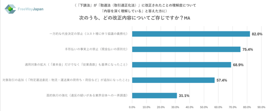 上記で「内容を深く理解している」と答えた方に、選択肢のうち、どの改正内容について知っているか聞いたところ、「一方的な代金決定の禁止(コスト増に伴う協議の義務化)」が82.0%、「手形払いの事実上の禁止(現金払いの原則化)」が75.4%、「適用対象の拡大(「資本金」だけでなく「従業員数」も基準になったこと)」が68.9%、「対象取引の追加(「特定運送委託:物流・運送業の荷待ち・荷役など」が追加になったこと))が57.4%、「面的執行の強化(違反の疑いがある業界全体への一斉調査)」が31.1%という結果だった。