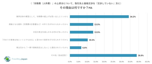 上記で「交渉していない」と回答した方に、その理由を聞いたところ、「業界全体の慣習として、労務費の値上げは言い出しにくいから」が34.2%、「根拠となる資料(労務費の計算書など)の作り方がわからなかったから」「次回の発注を減らされる恐れがあったから」がそれぞれ13.5%、「「代わりの業者は他にいくらでもある」と言われて契約を打ち切られそうだから」が10.3%、「発注元から「一律で価格改定はしない」と通告されていたから」が6.6%、「その他(自由回答)」が38.8%という結果だった。自由回答には、制度・契約形態・商習慣により価格交渉の余地がない、交渉のハードルや力関係への懸念を示す回答も見られた。