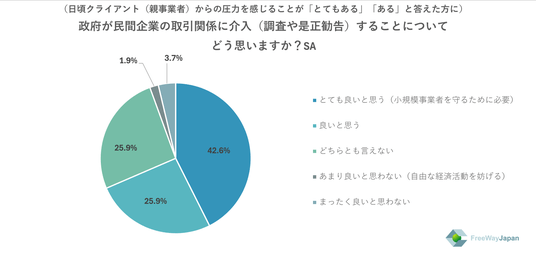一方、日頃、クライアント(親事業者)からの圧力を感じることが「とてもある」「ある」と回答した方に絞ると、「とても良いと思う(小規模事業者を守るために必要)」が42.6%、「良いと思う」「どちらとも言えない」がそれぞれ25.9%、「まったく良いと思わない」が3.7%、「あまり良いと思わない(自由な経済活動を妨げる)」が1.9%という結果だった。
