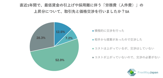直近1年間で、最低賃金の引上げや採用難に伴う「労務費(人件費)」の上昇分について、取引先と価格交渉を行ったか聞いたところ、「コストは上がっているが、交渉はしていない」が52.0%、「コストが上がっていないので、交渉の必要がない」が28.3%、「積極的に交渉を行った」が12.5%、「相手から提案があったので交渉した」が7.2%という結果だった。