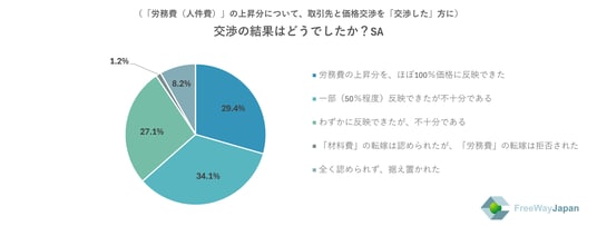 上記で「交渉した」と回答した方に、交渉の結果を聞いたところ、「一部(50%程度)反映できたが不十分である」が34.1%、「労務費の上昇分を、ほぼ100%価格に反映できた」が29.4%、「わずかに反映できたが、不十分である」が27.1%、「全く認められず、据え置かれた」が8.2%、「「材料費」の転嫁は認められたが、「労務費」の転嫁は拒否された」が1.2%という結果だった。