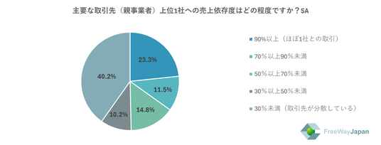 主要な取引先(親事業者)上位1社への売上依存度はどの程度か聞いたところ、「30%未満(取引先が分散している)」が40.2%、「90%以上(ほぼ1社との取引)」が23.3%、「50%以上70%未満」が14.8%、「70%以上90%未満」が11.5%、「30%以上50%未満」が10.2%という結果だった。この結果から、「労務費(人件費)」の上昇分の価格交渉実施率の背景には、取引先の代替性の少なさが交渉を困難にしている実態があることを読み取ることができる。