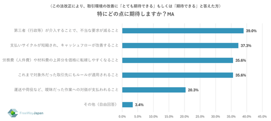 この法改正により、取引環境の改善に「とても期待できる」「期待できる」と答えた方に、特にどの点に期待するか聞いたところ、「第三者(行政等)が介入することで、不当な要求が減ること」が39.0%、「支払いサイクルが短縮され、キャッシュフローが改善すること」が37.3%、「これまで対象外だった取引先にもルールが適用されること」「労務費(人件費)や材料費の上昇分を価格に転嫁しやすくなること」がそれぞれ35.6%、「運送や荷役など、曖昧だった作業への対価が支払われること」20.3%、「その他(自由回答)」が3.4%という結果だった。