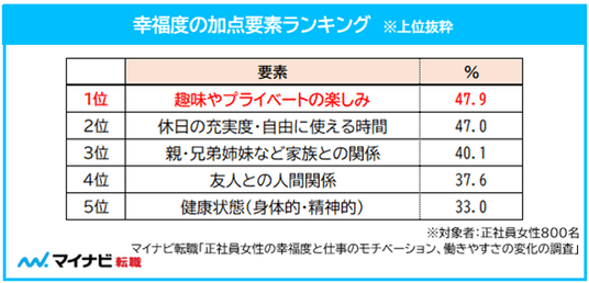 幸福度の自己点数について加点となる要素を聞いたところ、「趣味やプライベートの楽しみ(47.9%)」がトップとなり、「休日の充実度・自由に使える時間(47.0%)」「親・兄弟姉妹など家族との関係(40.1%)」と続いた。