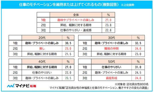 仕事のモチベーションを維持または上げてくれるものを複数回答で聞いたところ、「趣味・プライベートの楽しみ(27.0%)」がトップとなった。年代別ではいずれの年代でも「趣味・プライベートの楽しみ」が上位3位にランクインした。