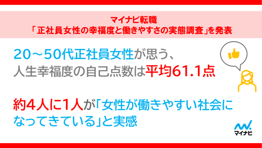 株式会社マイナビ(本社:東京都千代田区、代表取締役 社長執行役員:粟井俊介)が運営する総合転職情報サイト『マイナビ転職』(https://tenshoku.mynavi.jp/)は、正社員女性800名に聞いた、「正社員女性の幸福度と働きやすさの実態調査」の結果を発表しました。