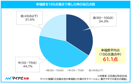 正社員女性に人生の幸福度を100満点で評価してもらったところ、80-100点は34.3%、50-79点は44.1%、49点以下は21.6%となり、平均点は61.1点であった。