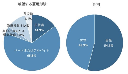 一方、「女性」のほうが「男性」よりも「扶養の範囲内で働きたいから」が9.9pt、 「生活との両立を図りたいから」が9.4pt、「すぐに働き始めたかったから」が6.5pt高くなった。いまある時間を有効に使えるスタイルでの仕事が求められているようだ。