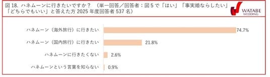 「結婚(事実婚も含む)をしたいと思いますか?」(図5)の設問に「はい(事実婚も含む)」「どちらでもいい」と答えた人に、ハネムーンに行きたいですか?と尋ねたところ、「ハネムーン(海外旅行)に行きたい」(74.7%)、「ハネムーン(国内旅行)に行きたい」(21.8%)と続き、合わせると、ハネムーンへ行きたい人は9割を超えることが分かりました。(図18)