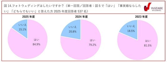 「結婚(事実婚も含む)をしたいと思いますか?」(図5)の設問で「はい」「事実婚ならしたい」「どちらでもいい」と答えた人に、フォトウェディングをしたいかどうか尋ねたところ、8割以上が「はい」(84.9%)と回答しました。2023年度は(81.5%)、2024年度は(79.2%)が「はい」と回答しており、3年連続で約8割の人が「フォトウェディング」をしたいことがわかりました。(図14)