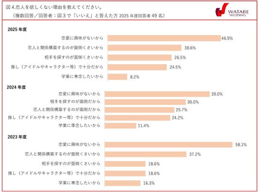 「いいえ」と答えた人に、恋人が欲しくない理由を尋ねたところ、約5割が「恋愛に興味がないから」(46.9%)と回答し、3年間とも最多の理由であることが分かりました。(図4)