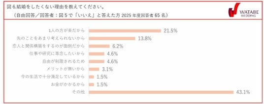 さらに「いいえ」と回答した2025年の回答者に結婚をしたくない理由を尋ねたところ、約2割が「1人の方が楽だから」と回答しました。(図6)