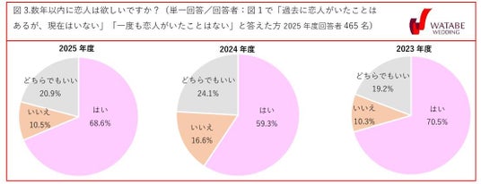 さらに、交際経験について尋ねた設問(図1)で「過去に恋人がいたことはあるが、現在はいない」「一度も恋人がいたことはない」と答えた人に、「数年以内に恋人は欲しいですか?」と尋ねると、約7割(68.6%)が「はい」と回答し、過去3年間も5割以上で推移しています。「いいえ」(10.1%)と回答した人は約1割で、過去3年間とも1割台でした。(図3)