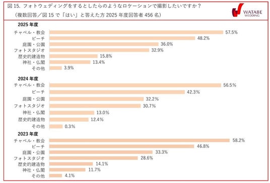 さらに、「はい」と答えた人に、「フォトウェディングをするとしたら、どのようなロケーションで撮影したいですか?」と尋ねたところ、「チャペル・教会」(57.5%)を選んだ人が約6割と最も人気があり、次いで「ビーチ」(48.2%)が約5割の人気でした。過去2年間も「チャペル・教会」が1位、「ビーチ」が2位とフォトウェディングのロケーションとして、高い人気を集めています。(図15)