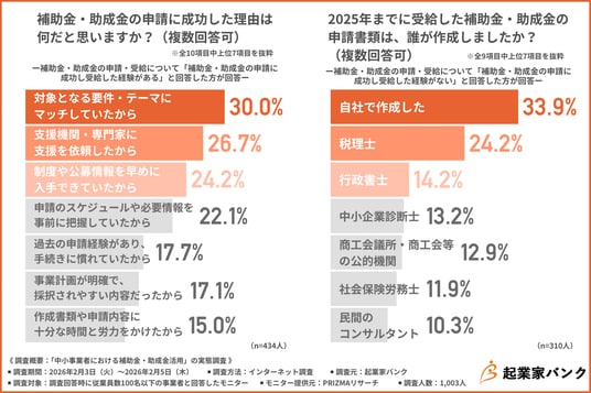 続いて、補助金・助成金の申請に成功し受給した経験がある方に、「補助金・助成金の申請に成功した理由は何か」について尋ねたところ、『対象となる要件・テーマにマッチしていたから(30.0%)』と回答した方が最も多く、『支援機関・専門家に支援を依頼したから(26.7%)』『制度や公募情報を早めに入手できていたから(24.2%)』と続きました。