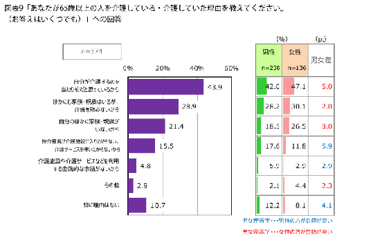 老老介護経験者に、介護をしている・していた理由を聞くと(図表9)、「自分が介護するのを当たり前だと思っているから」が43.9%が断トツで高い割合です。