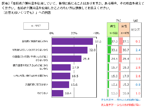 最も割合が高いのは「金銭的に負担を感じるから」の37.0%でした。そのあとは「何を選んだらいいかがわからないから」(32.0%)、「介護者にとって使いやすいものが見つからないから」(26.4%)、「被介護者の気に入るものが見つからないから」(17.0%)と続きます。