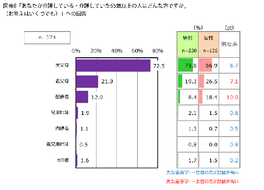 この質問については、被介護者の続柄によって、男女で大きな差があります。