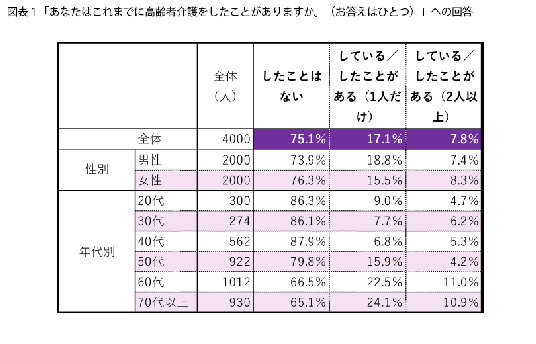 なお、回答は、「仕事での介護は除く」、「現在介護中の場合は、そちらも含める」という条件になっています。