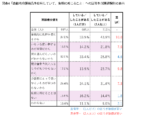 介護経験が1人だけか、2人以上かで分けて見ると(図表4)、2人以上の経験がある人は、「金銭的に負担を感じるから」「被介護者の気に入るものが見つからないから」「いちいち買い物するのが手間だから」「介護者にとって使いやすいものが見つからないから」と回答した人の割合が高くなっています。