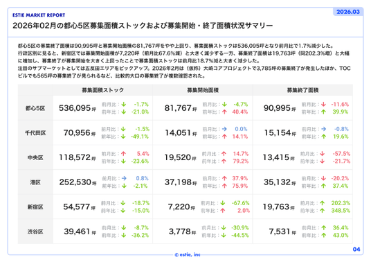 日本最大級の商業用不動産データ分析基盤「estie マーケット調査」を中心に複数のサービスを提供する株式会社estie(本社:東京都港区、代表取締役:平井 瑛、以下「estie」)は、「estie マーケット調査」による分析データをまとめた最新不動産マーケット動向レポート「エスティ マーケットレポート」2026年3月号を配信開始しました。