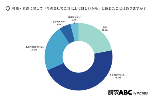 昇格・昇進に関して「今の会社でこれ以上は難しいかも」と感じたことがあるかの調査ついては、「やや感じている」(46.4%)が最も多く、「ある」(22.1%)と合わせると約7割にのぼります。
