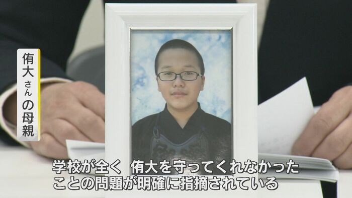 侑大さんの母親は「侑大が顧問にいじめを訴えた後、顧問が学校へ報告をしないまま、学校が全く侑大を守ってくれなかったことの問題が明確に指摘されている。『侑大が苦しかったことがちゃんと認めてもらえたよ』と伝えたい」と語った。