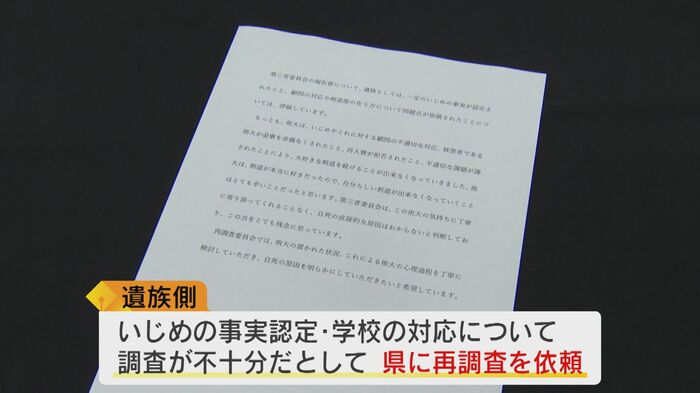 「侑大が、死を選ばざるを得なかった原因について明らかにしてほしい」(侑大さんの母親)。残された遺族は、いじめの事実認定や学校の対応についての調査が不十分だとして、県に再調査を依頼。