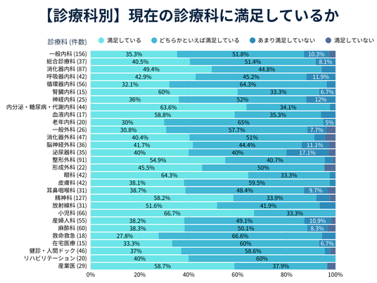 ・診療科別にみると、小児科では回答した66名の医師全てが「満足している」「どちらかといえば満足している」と回答した一方で、泌尿器科など一部の科では不満の割合が他科よりやや多い傾向もみられました。