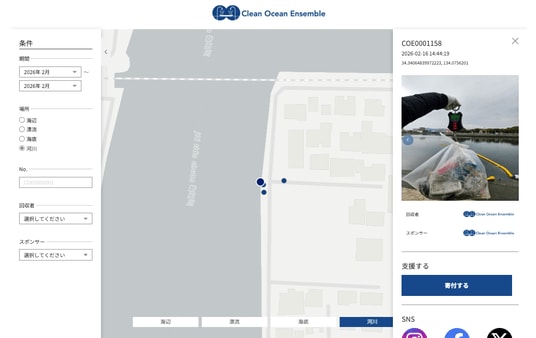下記のリンクからマップに移動していただき、左側の「No.」の検索バナーにて「COE0001158」と検索すると回収した河川ごみの情報が出てきます。