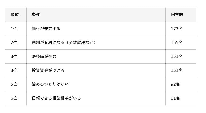 最も多かったのは「価格が安定する」(173名)でした。以下、「税制が有利になる(分離課税など)」(155名)、「法整備が進む」(151名)と続きました。