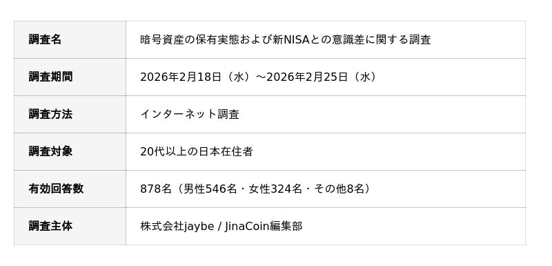 株式会社jaybe(本社:香川県高松市、代表取締役:水澤 誉往)が運営する暗号資産(仮想通貨)ニュースメディア「JinaCoin」(https://jinacoin.ne.jp/)は、20代以上の日本在住者878名を対象に、暗号資産の保有実態および新NISAとの意識差に関するインターネット調査を実施しました。