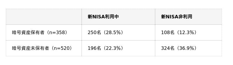 全体878名のうち、「新NISAを利用しているが暗号資産は現在保有していない」のは196名(22.3%)でした。