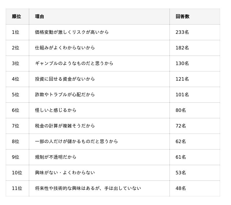 最も多かったのは「価格変動が激しくリスクが高いから」(233名)でした。以下、「仕組みがよくわからないから」(182名)、「ギャンブルのようなものだと思うから」(130名)と続きました。