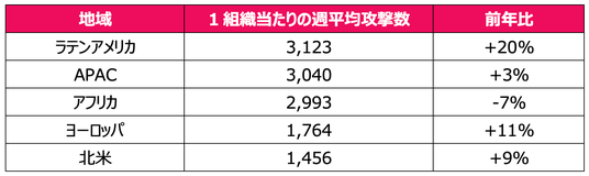 地域別の分析によって、急速なデジタル化が新たに進む地域に攻撃が集中していることが明らかになりました。最も多くの攻撃を受けたラテンアメリカでは1組織当たり週平均3,123件となり、増加率でも前年比20%という最大の数値を記録しました。これは、ラテンアメリカ圏で急成長するデジタル経済への攻撃者の関心が高まっていることを示しています。APACが週平均3,040件(前年比3%増)でこれに続き、アフリカは週平均2,993件(前年比7%減)となりました。