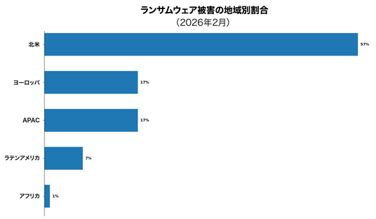 2026年2月には、世界で629件のランサムウェア被害が報告されました。これは前年比32%の減少です。この減少の主な原因は、前年の同時期にClopによる非常に大規模なランサムウェアキャンペーンが実施されていたことにあります。この異常値を除外すれば、ランサムウェア活動は前年比で概ね横這いとなっており、ランサムウェアが依然として持続的で、構造的な脅威であることが分かります。地域別では、北米で報告されたランサムウェア被害が全体の57%を占め、ヨーロッパとAPACではそれぞれ17%となりました。この結果は、デジタルインフラが密集し、収益化の可能性が高い地域が引き続きターゲットとされていることを示しています。
