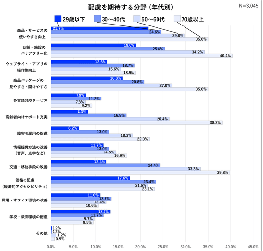 ・70代以上:「店舗・施設のバリアフリー化」(40.4%)や「交通・移動手段の改善」(39.8%)が突出しており、外出や移動における物理的ハードルの解消が強く切望されています。