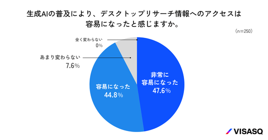 生成AIによりデスクトップリサーチで得られる情報へのアクセスが容易になったかを尋ねたところ、「非常に容易になった」が47.6%、「容易になった」が44.8%で、合わせて9割以上が容易になったと感じていることがわかりました(n=250)。