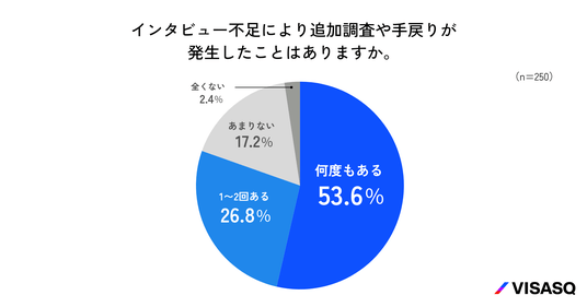 インタビュー不足による追加調査などの手戻り経験を尋ねたところ、「何度もある」が53.6%で最も多く、「1~2回」が26.8%と続き、合わせて80.4%が手戻りを経験していることがわかりました。(n=250)。