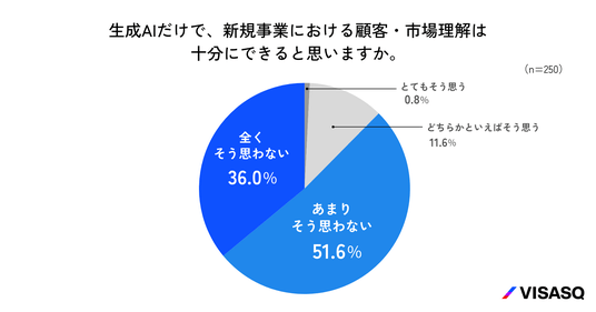 生成AIだけで、新規事業における顧客・市場理解は十分かを尋ねたところ、「あまりそう思わない」が51.6%、「全くそう思わない」が36.0%で、合わせて約9割が生成AIだけでは顧客理解が不十分と感じていることがわかりました(n=250)。