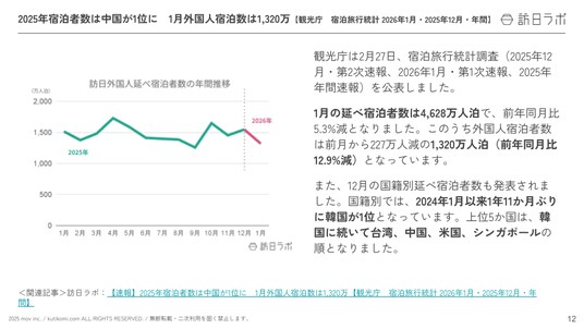 - 2025年宿泊者数は中国が1位に 1月外国人宿泊数は1,320万