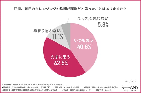 そこで、「毎日のクレンジングや洗顔が面倒だと思ったことはあるか」と質問したところ、約8割が『いつも思う(40.6%)』『たまに思う(42.5%)』と回答しました。