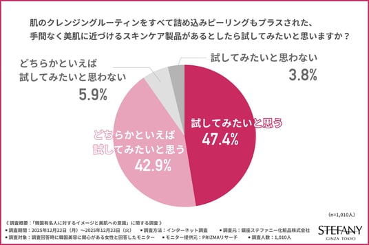 「肌のクレンジングルーティンをすべて詰め込みピーリングもプラスされた、手間なく美肌に近づけるスキンケア製品があるとしたら試してみたいと思うか」と質問したところ、約9割が『試してみたいと思う(47.4%)』『どちらかといえば試してみたいと思う(42.9%)』と回答しました。