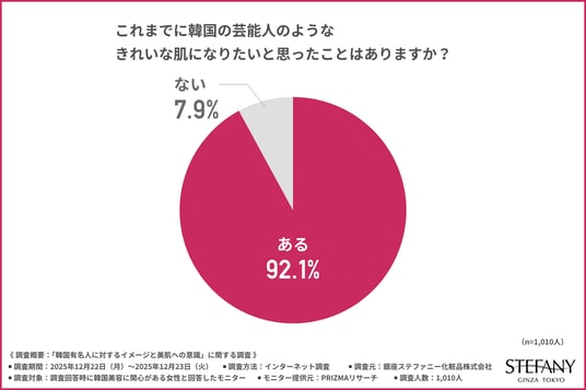 「これまでに韓国の芸能人のようなきれいな肌になりたいと思ったことはあるか」と質問したところ、約9割が『ある(92.1%)』と回答しました。