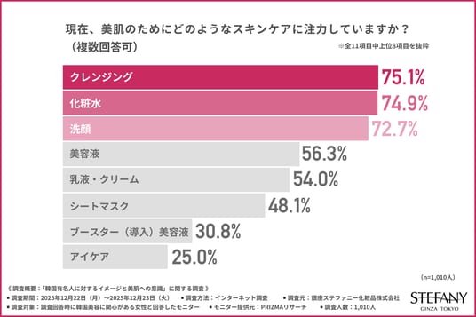「現在、美肌のためにどのようなスキンケアに注力しているか」と質問したところ、『クレンジング(75.1%)』と回答した方が最も多く、『化粧水(74.9%)』『洗顔(72.7%)』となりました。