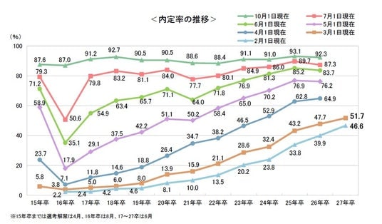 ○内定率は51.7%。広報解禁のタイミングで5割を上回るのは初めて