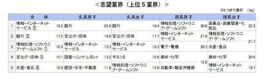○1位「インターネットサービス」、2位「銀行」、3位「情報処理・ソフトウエア」