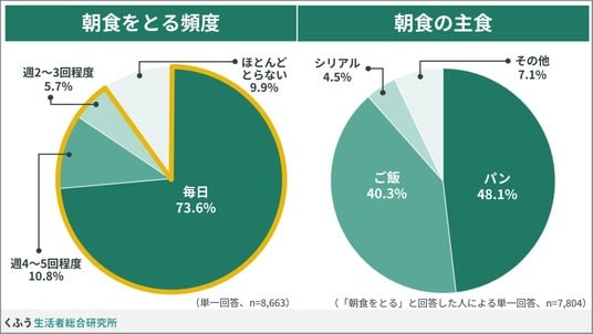 朝食は7割以上の人が「毎日食べる」と回答。朝食をとる人のうち、主食は「パン」(48.1%)が約半数であり、「ご飯」(40.3%)と回答した人を上回りました。