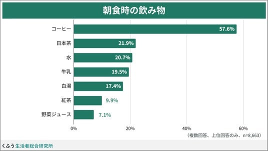 朝食の飲み物は、主食に関わらず「コーヒー」が約6割(57.6%)と圧倒的に多くなりました。