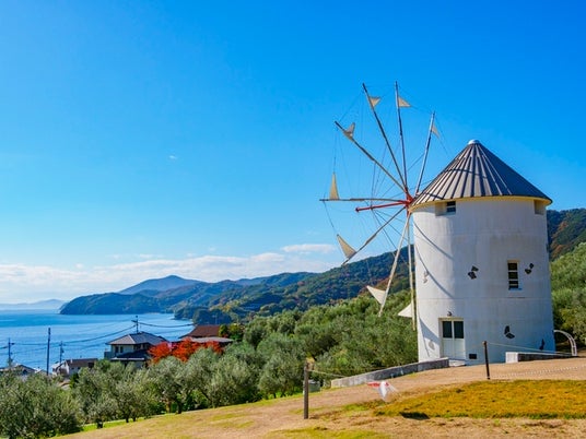 実写版映画『魔女の宅急便』のロケセットを活かしたフォトスポットの聖地として知られる道の駅 小豆島オリーブ公園。園内にはギリシャ風車をはじめ、物語の世界観を思わせる風景が広がり、まるで映画のワンシーンに入り込んだかのような体験が楽しめます。